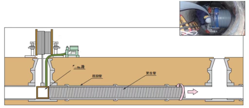 在待修复管道内,通过固定式缠绕机头用特制PVC带材缠绕成比原管道小的管道,并在卡扣处埋设一根钢丝,待管道缠绕完成,从管内抽动钢丝,切断卡扣后通过螺旋的扩张应力,将管道紧贴修复管道内壁。适用于DN200-DN600mm的圆形管道的修复。该修复方法不需要注浆处理。